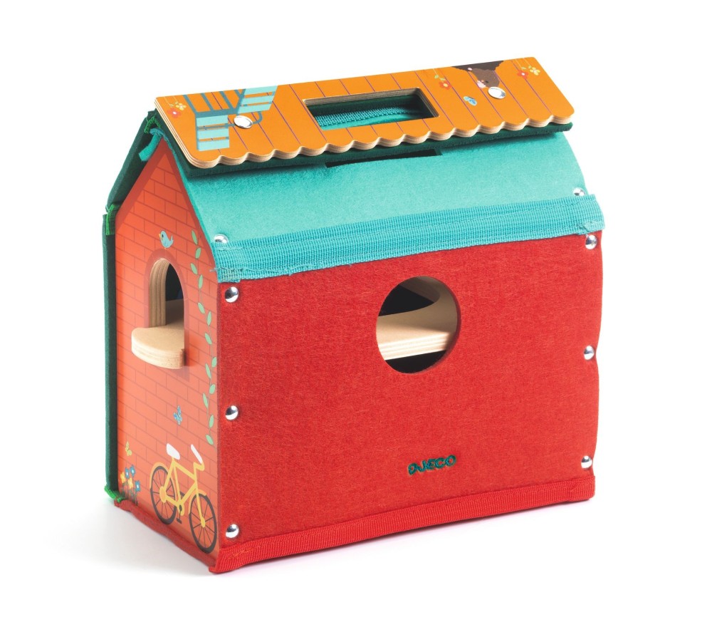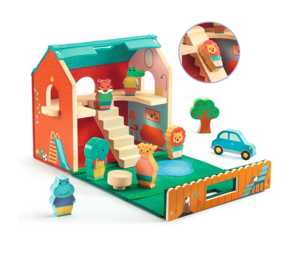 Una dolcissima prima casetta in legno e feltro, con 6 personaggi e 4 accessori in legno (un’automobile, una scala che si trasforma in uno scivolo, un tavolo e un albero) e un grande giardino per vivere tante avventure.