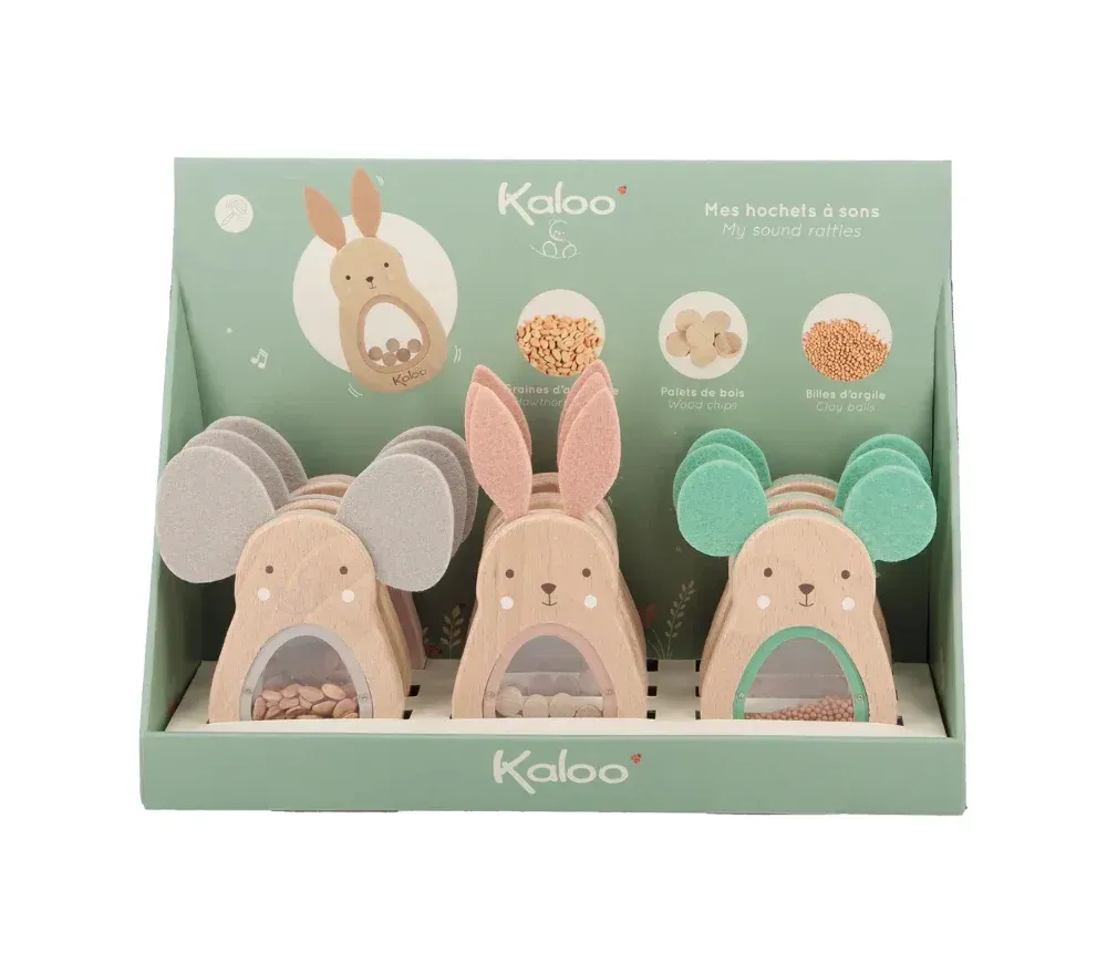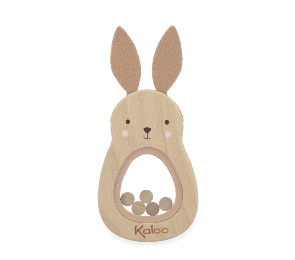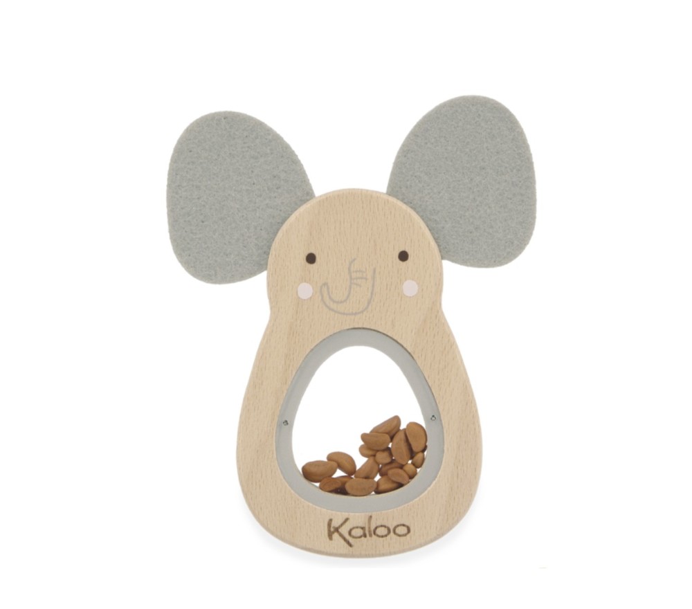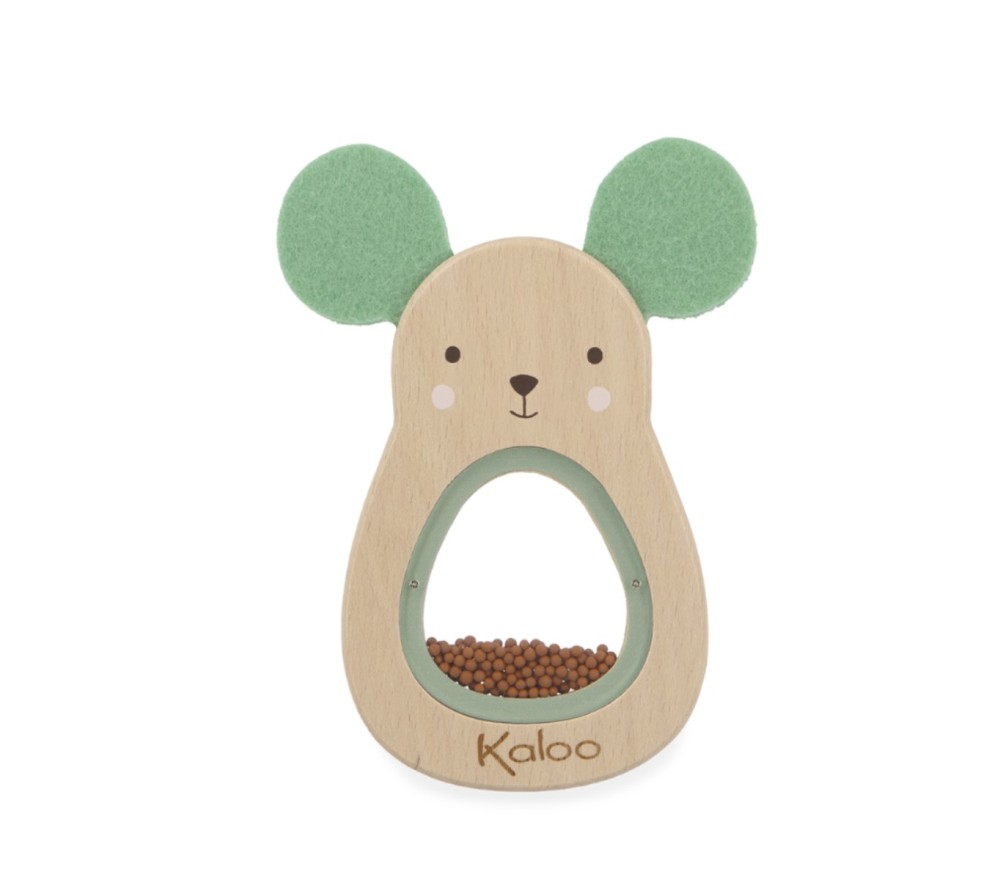 Un originale sonaglino in legno di faggio a forma di animaletto. La pancia trasparente lascia vedere i semi naturali che producono un delicato suono. Orecchie in feltro.