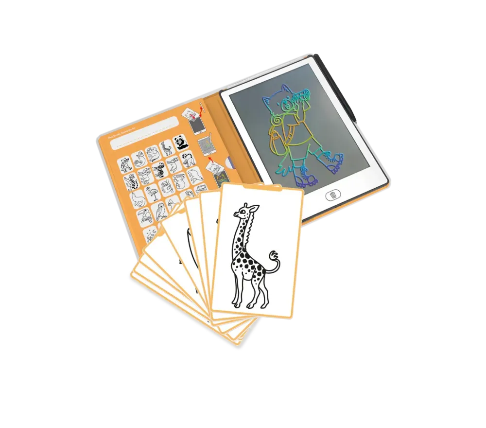 E' inoltre dotato di schede con tante illustrazioni diverse che si possono inserire nello schermo, per poterle ricalcare e imparare così a disegnare.