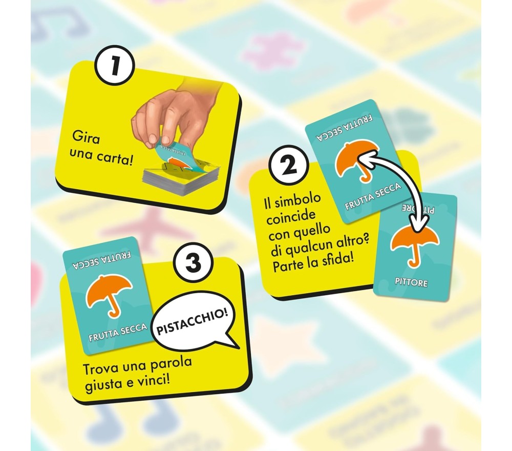 n Tilt, ogni giocatore pesca una carta da uno dei due mazzi e la posiziona a faccia in su davanti a sé. Se il simbolo sulla carta coincide con quello di un altro giocatore, la sfida ha inizio! Il primo che riesce a pronunciare una parola appartenente alla categoria della carta dell'avversario vince la sfida e si aggiudica quella carta. Le meccaniche di gioco sono semplici, ma la velocità e l'intuito sono essenziali per emergere vincitori. Tilt è progettato per essere accessibile a tutti, garantendo partite rapide e piene di energia.