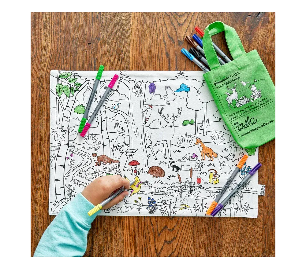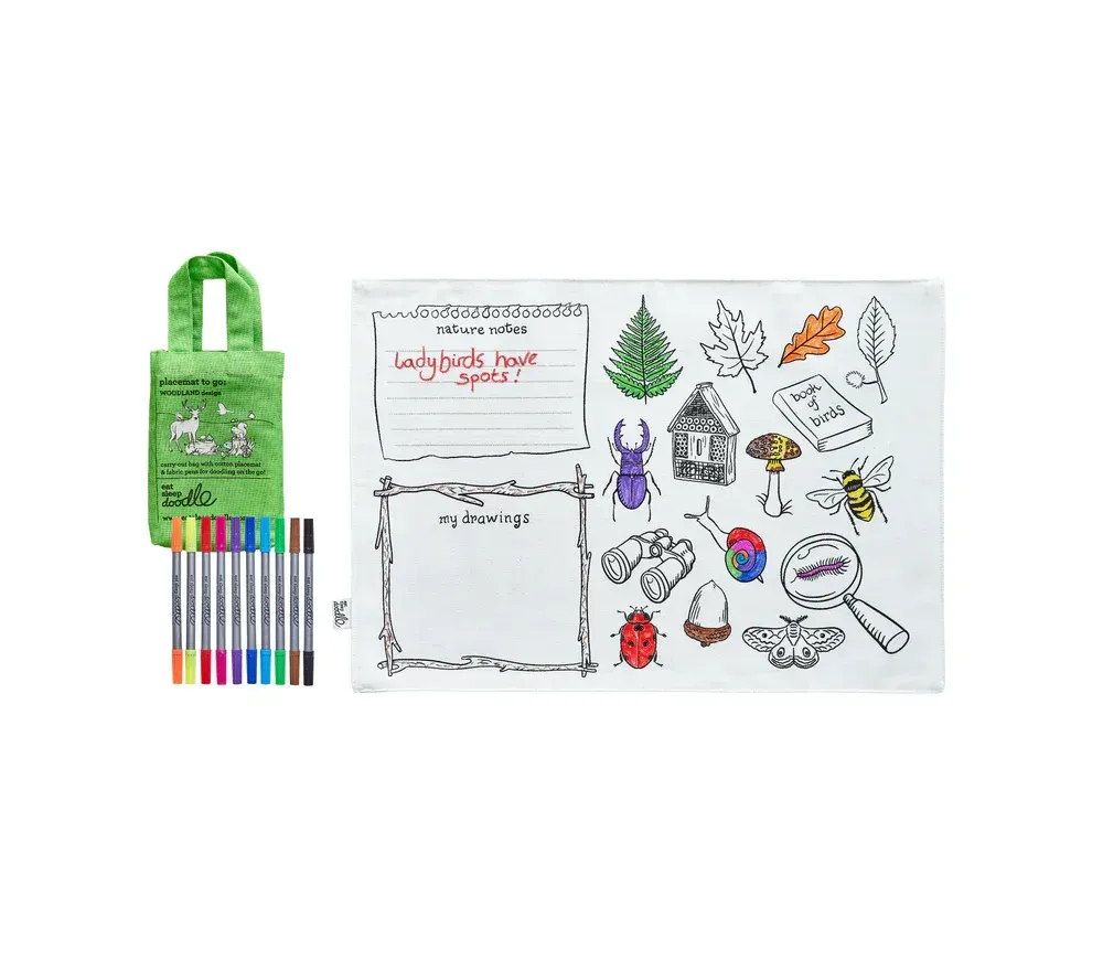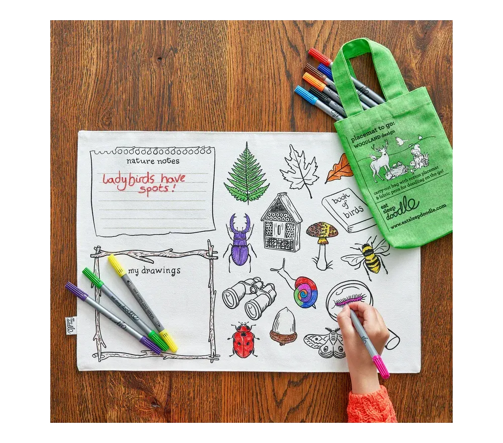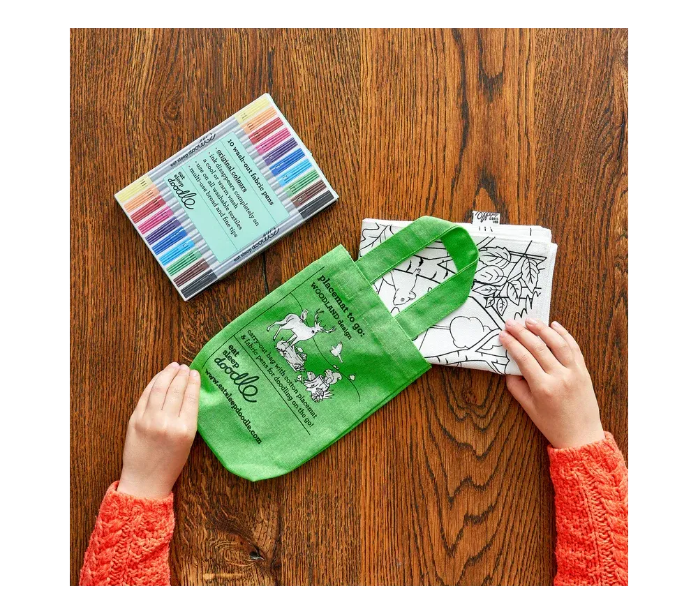 Eatsleepdoodle è una piccola azienda britannica che ha trasformato oggetti utili di uso quotidiano (tovagliette, borse, sacche-zaino) in un'esperienza creativa e super divertente!