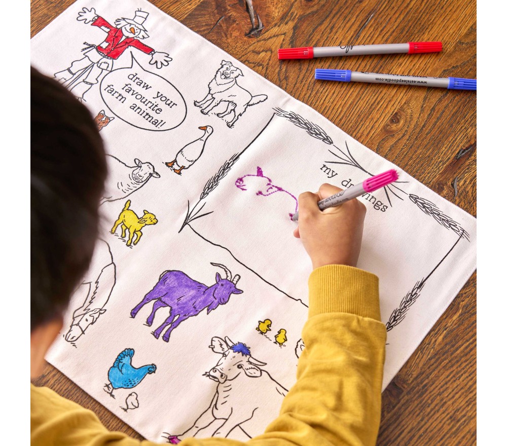 Eatsleepdoodle è una piccola azienda britannica che ha trasformato oggetti utili di uso quotidiano (tovagliette, borse, sacche-zaino) in un'esperienza creativa e super divertente!