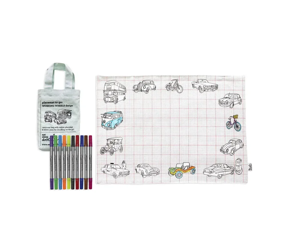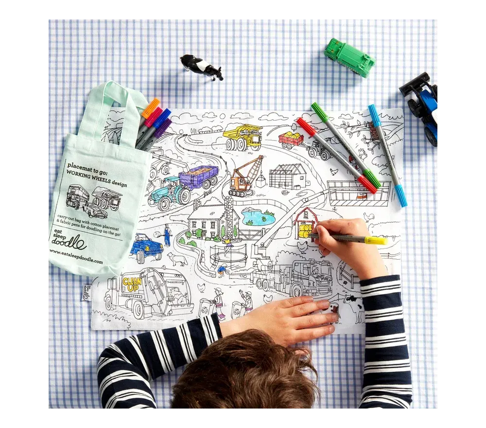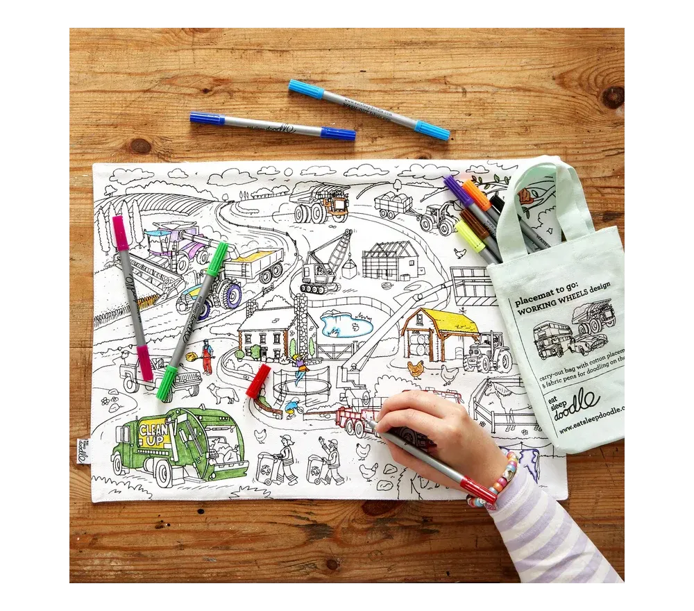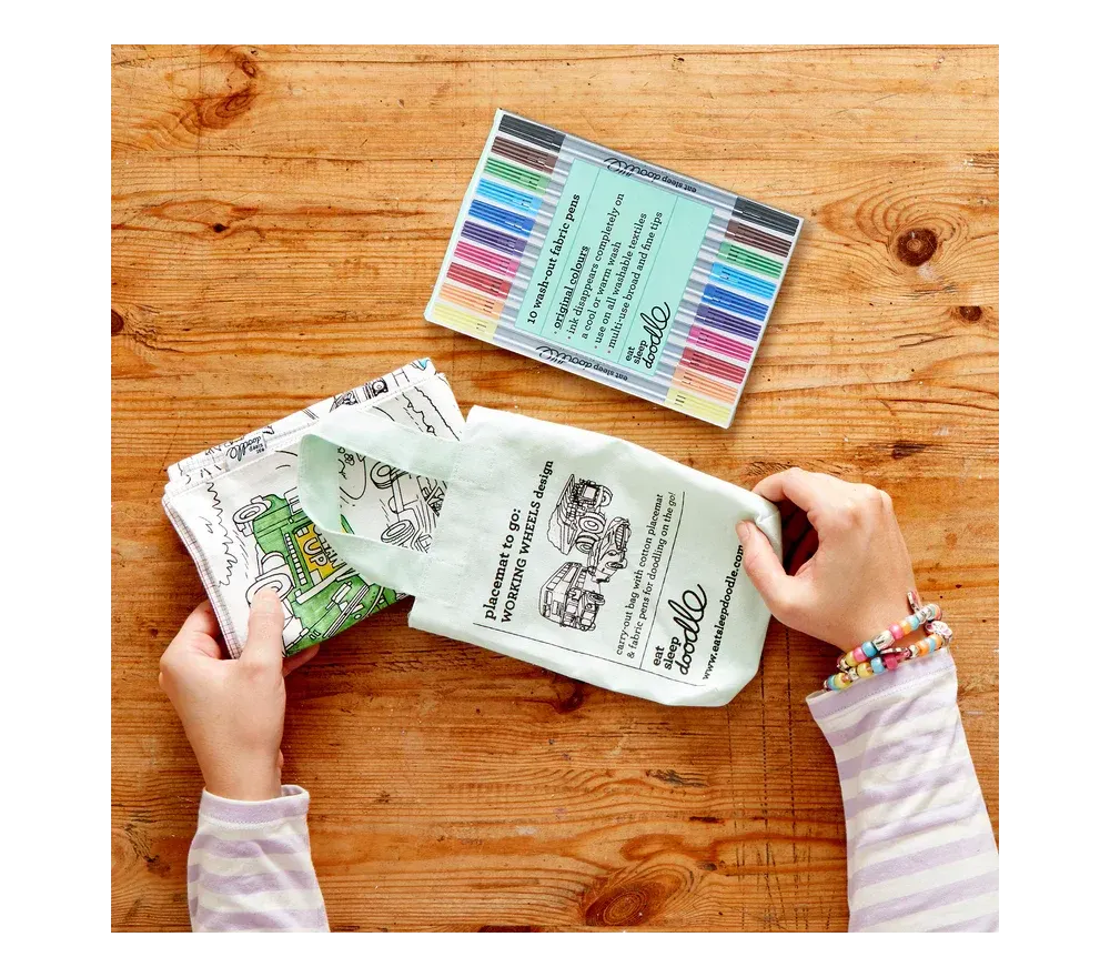 Eatsleepdoodle è una piccola azienda britannica che ha trasformato oggetti utili di uso quotidiano (tovagliette, borse, sacche-zaino) in un'esperienza creativa e super divertente!