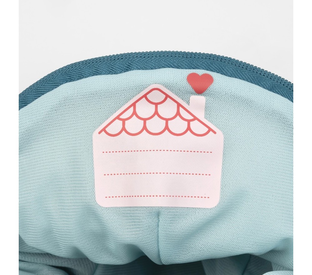 Lo zainetto ha spallacci regolabili, cinturina per fissarlo davanti e un'etichetta interna per il nome.